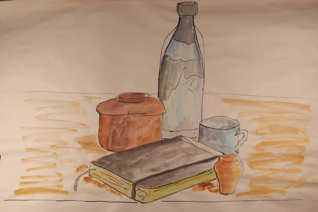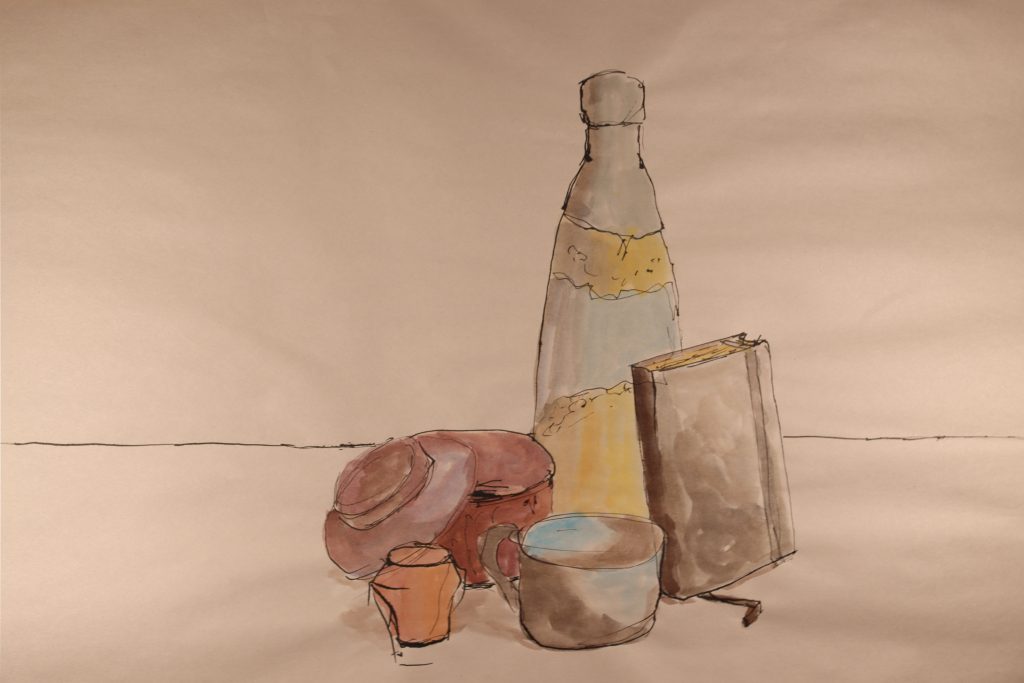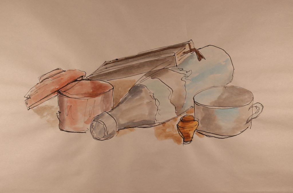 To practice freehand techniques, still lifes of objects around the house were done in ink gesture and quick watercolor washes. Throughout the course, this skill was developed in quickly judging and recording shape, scale, and perspective. This was also an opportunity to practice composition and to consider how objects can relate to one another.
